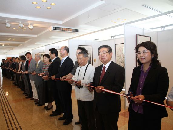 中国驻日本大使夫人汪婉(右1)石川县副知事竹中傅康(右2)为展览开幕式剪彩